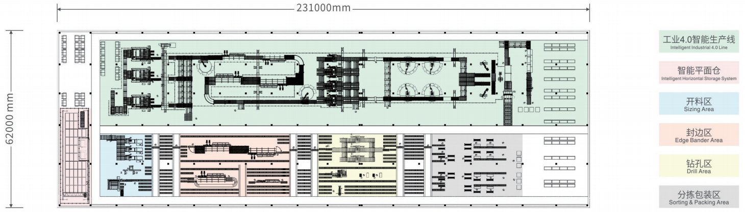 The above-mentioned smart home factory is suitable for large-scale flexible whole-house custom home production,such as wardrobes,cabinets,shoe cabinets,wine cabinets, bathroom cabinets,balcony cabinets and other door-to wall cabinets integrated into various types of panel home furnishing.This solution consists of three parts:intelligent production line,section automation or manual production line.The intelligent factory only needs to be equipped with no more than 65 people.The plant area is about 10,000 square meters,with an annual output value of about RMB 200 million.